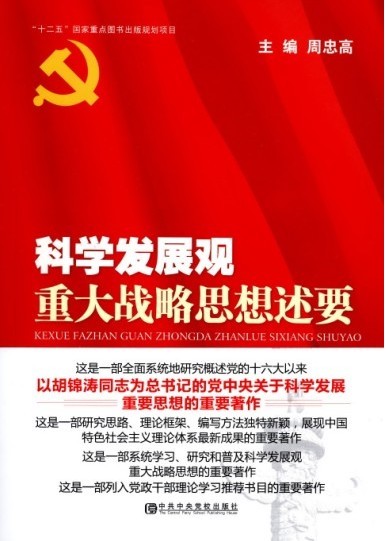 由全国政协常委、中共中央党校原副校长李君如,中共山东省委常委、宣传部长,省社科联主席孙守刚作序,山东省社科联副主席主编的《科学发展观重大战略思想述要》一书,由中共中央党校出版社出版,由北京阳光书苑有限公司发行。作为“十二五”国家重点图书出版规划项目,作为迎接党的十八大召开的献礼之作,这部著作对党的十六大以来胡锦涛等中央政治局常委有关科学发展的重要讲话和党的重要文献进行了全面系统地梳理、归纳、概括和凝练,以全新的视角、大胆的创新,理清其思想脉络,构建其理论框架,论述严谨、有理有据,充分展现出中国特色社会主义理论体系最新成果,为广大党员和干部学习研究贯彻落实科学发展观提供有益参考。