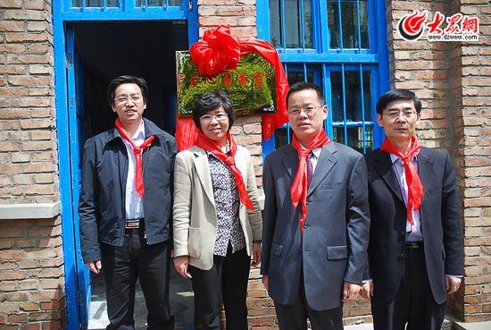 大众网董事长、总经理林忠礼,齐鲁书社总编辑昝亮,禹城市人大常委会第一副主任李玉梅,禹城市市委常委、宣传部长闫秀丽一起为爱心图书室揭牌。(大众网记者 王长坤 摄)