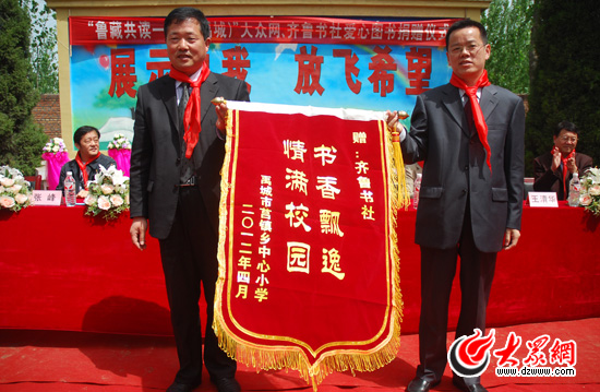 莒镇乡总校长李金国先后向林总和昝亮敬献锦旗。捐赠仪式后,大众网董事长、总经理林忠礼,齐鲁书社总编辑昝亮,禹城市人大常委会第一副主任李玉梅,禹城市市委常委、宣传部长闫秀丽一起为爱心图书室揭牌。