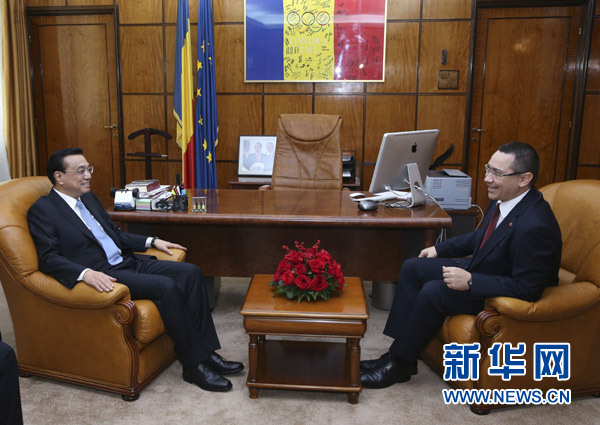 李克强表示,中国与中东欧国家不仅传统友谊深厚,而且经济发展有很强互补性。罗马尼亚是中东欧地区大国,也是中国-中东欧合作的积极参与者和推动者。我愿与总理先生共同努力,推动明天举行的领导人会晤取得新的成果。罗马尼亚是欧盟的一员。中国始终从战略高度看待中欧关系,坚定支持欧洲一体化建设。我们希望看到一个团结、繁荣、发展的欧洲和强大的欧元,这有利于世界多极化和文明多样性。中方愿与罗方共同努力,推动中国-中东欧合作和中欧关系取得更大发展。