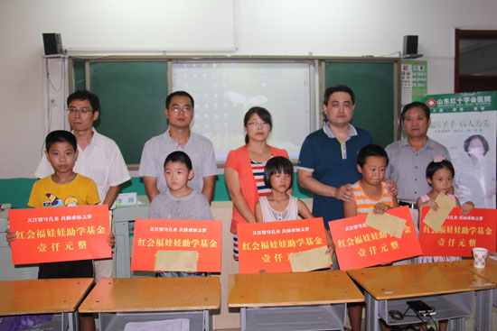 为山东省水利厅驻东平县大羊镇“第一书记”帮扶村特困留守儿童代表颁发了红会福娃娃助学基金