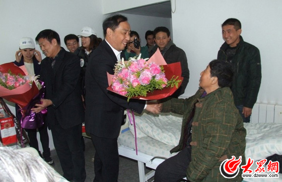图为浦发银行济南分行行长孔建为患者送上鲜花及慰问品。