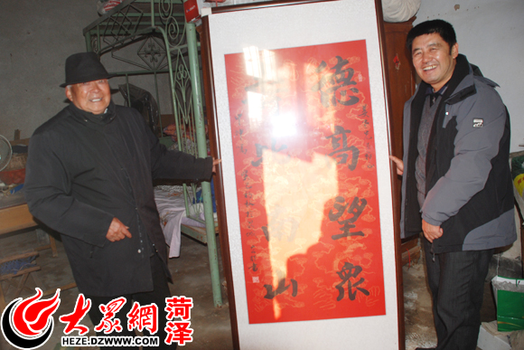 刘中坤(右)从济南带了一块祝寿牌匾送给85岁的村民姜喜山