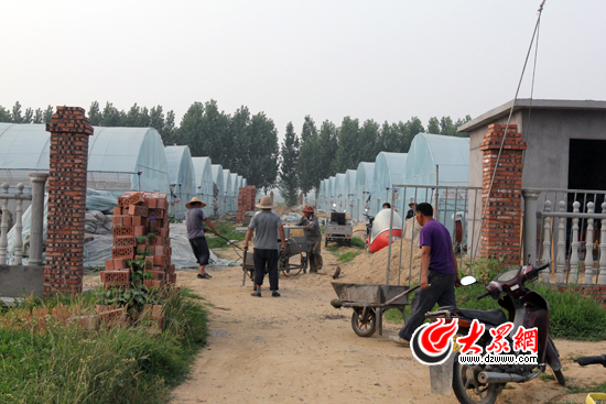 申维龙从临沂烟草公司“借”来的16间新型大棚正在紧张施工,再过一个月,这里的路面将全部硬化,排水渠道也将全面建成。大众网记者 尹海洋摄