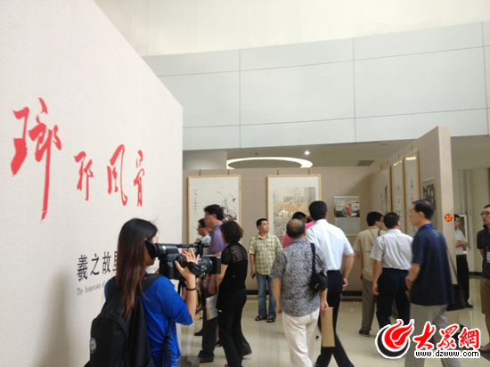 19日,南线媒体行采访团来到临沂文化中心。记者们正在参观王羲之书画作品。(大众网记者 李兆辉摄)