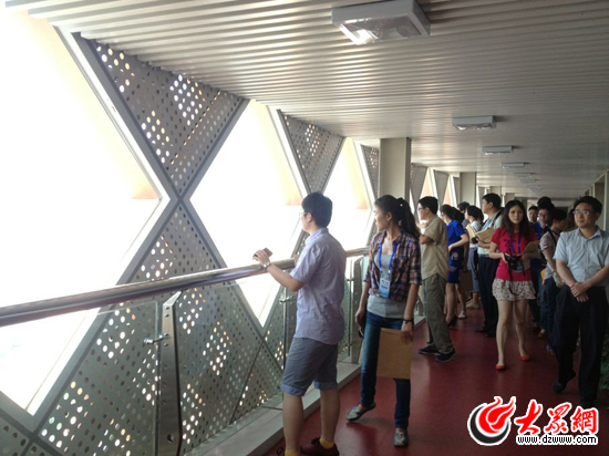 19日,”聚焦美丽山东-第九届中国网络媒体山东行”南线采访团来到临沂文化中心。记者在326米的高楼上俯瞰临沂建设全貌。(大众网记者 李兆辉摄)