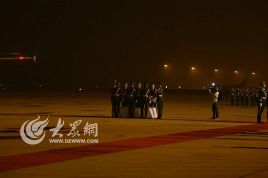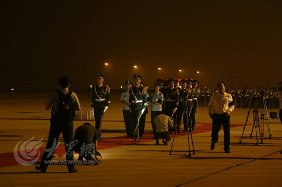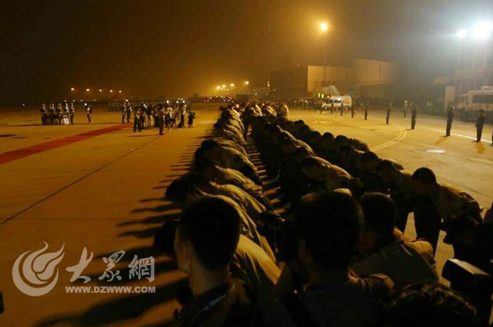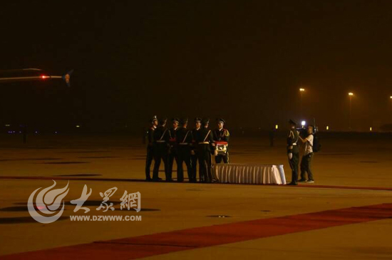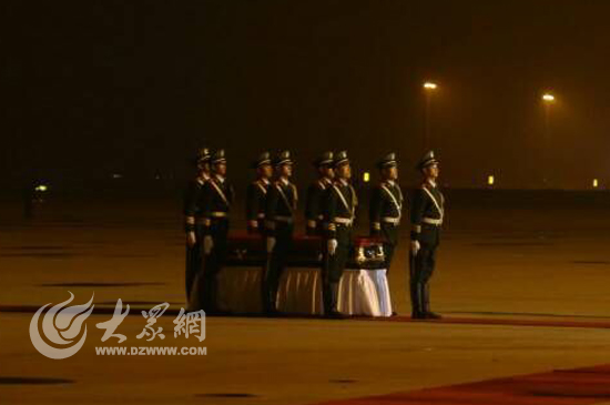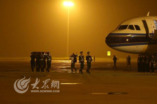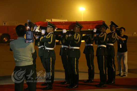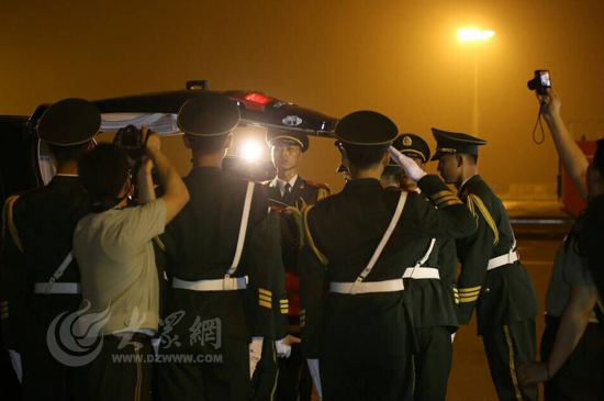 大众网济南8月1日讯(见习记者 赵兵 亓翔)20:13分,武警山东总队司令员李苏鸣宣布迎接仪式开始,礼兵就位。在礼兵的护送下,覆盖着中华人民共和国国旗的英烈灵柩,被缓缓抬下飞机。现场庄严肃穆。