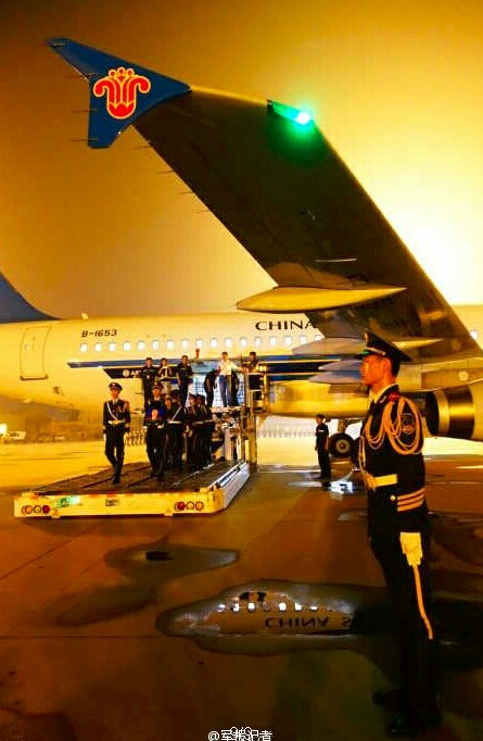 载着张楠烈士灵柩的飞机已在遥墙机场降落