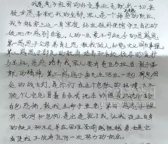 我愿意为祖国的外交事业贡献出一切,甚致(至)甘愿奉献我的全部。军人是一个神圣而光荣的职业,我为能穿上这一身军装站在驻外使馆守卫自己的领地而感到自豪。人的一生最不可缺少的是感恩,第一感恩于父母养育之恩,教我做人,知晓大义明白事理;第二感恩于部队的教育培养和各级领导的爱护与关怀,是您培养我军人要有责任与担当,敢于奉献的精神;第三感恩于每天生活在一起,朝夕相处的战友们,是你们在这个危险的环境下不顾个人安危冒着自杀式汽车炸弹袭击过后的白色恐怖,救我生命于垂危;第四感恩于挫折、坎坷和危机,是它造就了我,让我改正自身的缺点和不足,并在困难面前越挫越勇,也是它有使我不放弃任何一次努力的机会。