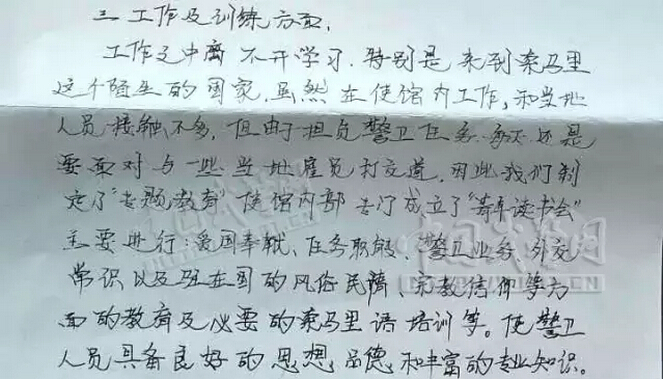工作之中离不开学习,特别是来到索马里这个陌生的国家,虽然在使馆内工作,和当地人员接触不多,但由于担负警卫任务,每天还是要面对与当地雇员打交道。因此,我们制定了“专题教育”使馆内部专门成立了“青年读书会”主要进行:爱国奉献、任务职能、警卫业务、外交常识以及驻在国的风俗民情、宗教信仰等方面的教育及必要的索马里语培训等。使警卫人员具备良好的思想品德和丰富的专业知识。