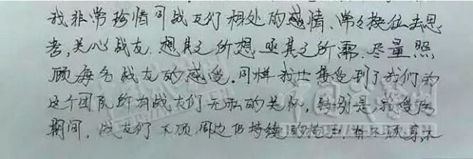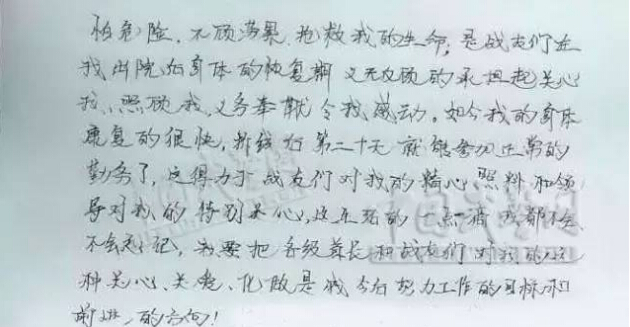 我非常珍惜同战友们相处的感情、常常换位去思考,关心战友,想其之所想,亟(急)其之所需,尽量照顾每名战友的感受。同样,我也接受到了我们的这个团队所有战友们无私的关怀,特别是我受伤期间,战友们不顾周边仍持续的枪声,奋不顾身,不怕危险,不顾劳累抢救我的生命,是战友们在我出院后身体恢复期义无反顾的承担起关心我、照顾我,义务奉献令我感动。如今我的身体康复的很快,拆线后第二十天就能参加正常的勤务了,这得力于战友们对我的精心照料和领导对我的特别关心,这生活的一点一滴我都不会(不会)忘记,我要把各级首长和战友们对我的这种关心、关爱、化作(是)我今后努力工作的目标和前进的方向!