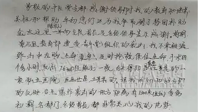 尊敬的中队党支部,感谢领导们对我的教育和培养,关怀和帮助。年初您们还为我争取到了特别困难补助金,在这里代表家人一并向支队首长及各位领导表示感谢。前期,索马里教育部遭受青年党组织的袭击,我不幸被流弹击中左胸,生命垂危!及时抢救保住生命,手术四个多小时,取出7.62mm口径弹头一枚,后来得知是住在土耳其的一家私立医院,医生也是土耳其的。据我所知和战友们的反映,发生爆炸袭击的地方距离有1300米(直线)。受伤初期,各部门、各级首长都非常关心我的伤势。