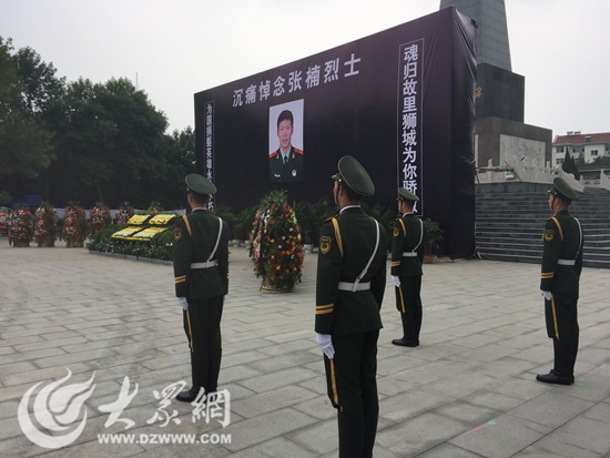 在沧州市烈士陵园,来自武警沧州支队的官兵、公安干警、中小学生和其他群众,早已排列整齐,在此迎接。烈士纪念碑前拉起了幕布,上面贴着张楠烈士巨大的遗像,两旁的挽联上写着“为国捐躯英雄永垂不朽,魂归故里狮城为你骄傲”。纪念碑前放满了社会各界敬献的花圈和花篮。