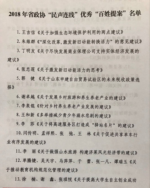 大众网-海报新闻济南12月13日讯(记者 樊思思)12月13日,山东省政协举行2018年“民声连线”优秀“百姓提案”表彰活动,根据评选结果,共有20件提案上榜,获评优秀“百姓提案”。同时,省政协十二届二次会议“民声连线”活动即日起正式启动。