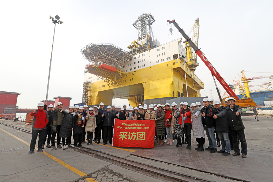采访团的记者在中集来福士蓝鲸二号前接受采访。