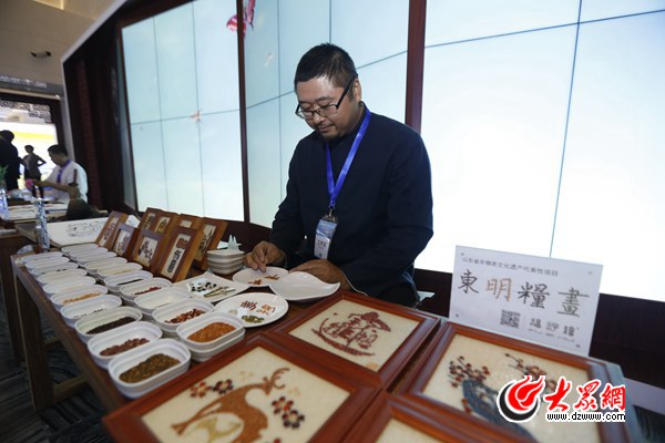 紧挨着年画展位的是东明粮画。由非遗传人韩国瑞创作的一幅幅“粮食画”,吸引了不少中外嘉宾驻足观看。与中国传统的水墨画不同,这些粮画由谷子、芝麻、小米、玉米、红玉米、黄豆瓣、蚕豆、黑豆、红豆、花种子等材料制作而成。东明粮画制作技艺是第四批省级非物质文化遗产代表性项目,迄今已有一千七百多年的历史,主要是巧妙利用各种粮食种子的自然形状和颜色,经过防腐防虫处理后,精心拼粘,创作而成的一种传统民间工艺画,一般以书法、山水、花鸟、人物和吉祥图案为主,具有“国泰民安、五谷丰登”的美好寓意。
