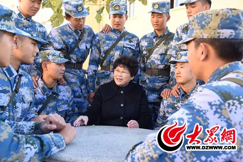 2016年11月1日,北海舰队某部新兵训练基地的训练场上,新入伍的海军管兵聆听于爱梅讲述沂蒙精神