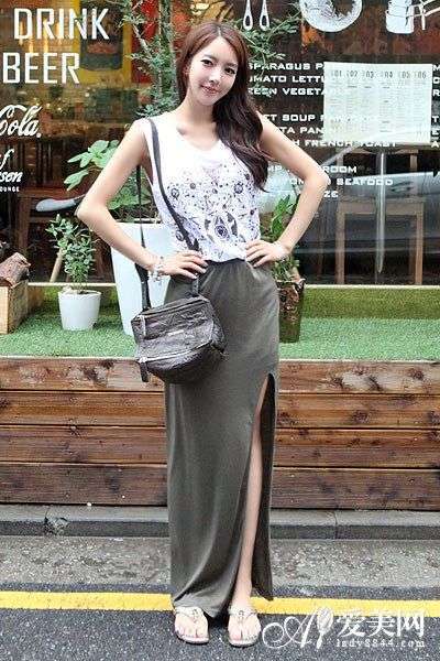 小编心得>>>>长裙剪裁修身,能突显出下半身婀娜的曲线美。高裙杈设计令纤长的双腿若隐若现,性感又不过分暴露。配搭白色印花T恤简约又优雅。