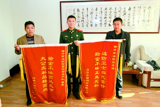 今天上午,菏泽的赵先生带着感谢信和锦旗来到济南边防检查站,当面感谢拾金不昧的济南边防检查站勤务中队一班班长曹威(左图中)。