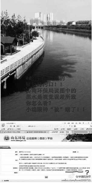 前不久,一位网友向山东省环保厅和济南市环保局投诉称小清河历山路桥东北侧有“黑水”流入河内,随后,山东省环境网公众投诉(信访)平台回复,“水呈黑色为视觉差所致并非污水”。