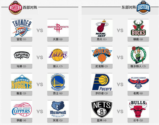 北京时间4月18日,2012-13赛季常规赛进入最终日,东西部座次最终排定。西部季后赛首轮对阵为:雷霆vs火箭,马刺vs湖人,掘金vs勇士,快船vs灰熊;东部季后赛首轮对阵为:热火vs雄鹿,尼克斯vs凯尔特人,步行者vs老鹰,篮网vs公牛。