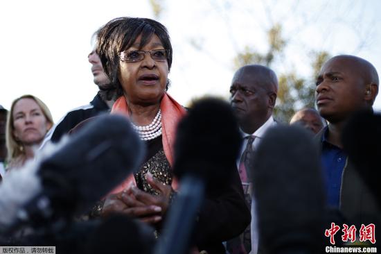 当地时间6月28日,南非前总统曼德拉的前妻温妮在南非比勒陀利亚接受美联社等媒体采访时称,与数天前相比,曼德拉的病情已得到“很大改善”,不过依然危急。图为温妮接受媒体采访。