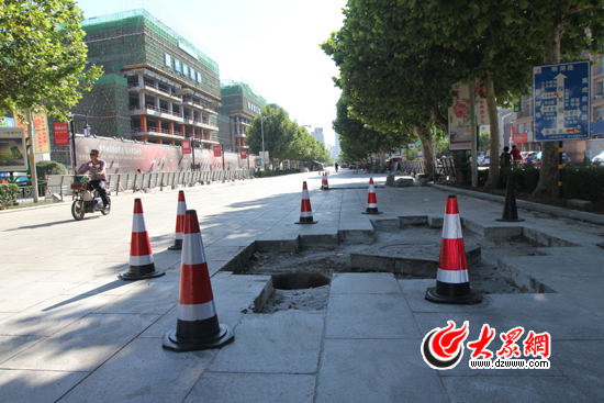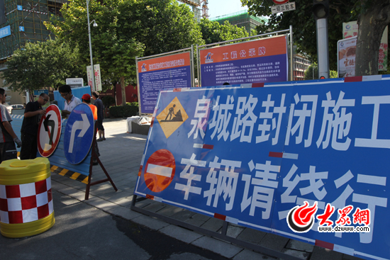 泉城路进行封闭施工,工作人员已经在路东口设立了警示牌和隔离装置。