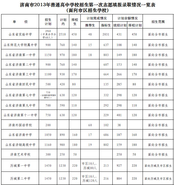 大众网济南7月12日讯(记者 姜洋)今天上午10点,济南21所面向市区招生的高中公布了2013年中考第一次志愿填报录取情况。山东省实验中学共录取推荐生48人、指标生2031人;目前计划余额881人,其中统招计划431人、择校计划450人。