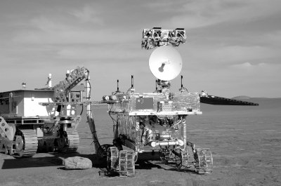 这张拍摄于2011年10月5日的照片显示,嫦娥三号着陆器和巡视器(即月球车)正行走在一片寸草不生的沙漠上。记者从航天科技集团了解到,这项“外场试验”由航天科技五院负责。去年10月,五院的技术人员分乘9辆运输车,满载着月球车初样车及其伴随车、地面机械支持设备和试验测试设备等,从北京出发,最终与100多名来自20余家单位的试验队员在无人区会合。他们在这里搭起板房和帐篷,将之命名为“望舒村”——出自《楚辞·离骚》的这个词意思是“为月亮驾车的女神”。