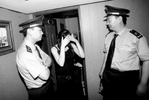 昨晚,公安等部门突查部分娱乐场所。检查显示,部分场所存在涉恶、涉黄、涉赌、涉毒等违法活动。晚8时30分,记者随执法人员来到海淀区“同一首歌餐饮娱乐有限公司”,一名胸佩“主任”字样的男子称,9层的俱乐部已停业,但执法人员却发现,9层一个包间内有6个身穿学生制服的年轻女子,她们自称是“服务员”。随后,执法人员发现9层有一个暗门,在门外楼梯上,3名年轻女子正站在黑暗处。她们身后又有一个暗门,推开后里面竟又是一整层的包间。