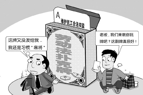 笔者认为,给务工人员发放“劳动法扑克牌”,其用意是好的。但现实中,工头老板和民工是雇佣与被雇佣的关系,大多数民工只能无条件地服从于工头领导的安排。民工们别无所求——只要求工资能及时发放,他们不敢奢望加班有加班费,更不敢在节假日里索要什么“双薪”、“三薪”。难道我们的民工们不懂得《劳动法》吗?难道他们不想维护自己的合法权益?