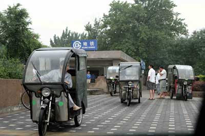 回龙观龙泽城铁站外不远处的马路边上,七八辆“黑摩的”、“黑三轮”排成一行,按照先后顺序载客。只要三四元钱,就可以载着乘客在这个总面积32.7平方公里、北京市最大的经济适用房社区转个遍。