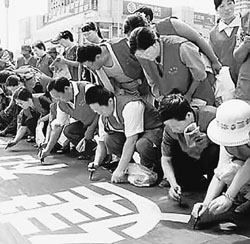 7月28日,兰州市千名城市协管员上街巡察启动仪式在东方红广场举行,身着红马甲的协管员们在条幅上签名。(资料照片)