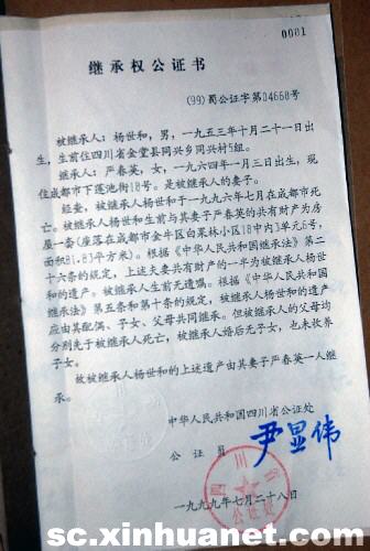 在成都市律政公证处,记者翻阅了那份卷宗号为(99)蜀公证字第04668号的继承权公证书。公证书上明确写道:“被继承人杨世和于一九九六年七月在成都市死亡”“被继承人婚后无子女”“被继承人杨世和的上述遗产由妻子严春英一人继承”。
