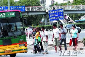 配图:8月17日,北京市南三环刘家窑公交车站附近的行人在违章穿行马路,而不远处就是过街天桥 新华社发