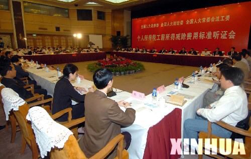 资料图:2005年9月27日,个人所得税工薪所得减除费用标准立 法听证会――立法法规定听证制度以来全国人大常委会立法中的第一次听证会在北京举行。 新华社记者 李晓果 摄