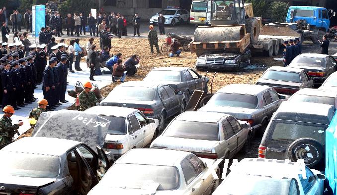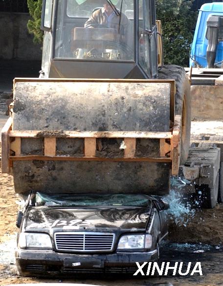 12月6日,在销毁现场,推土机压过一辆走私汽车。 当日上午,宁波海关首次公开销毁了包括奔驰、宝马等多个品牌在内的19辆走私车辆。据了解,这是浙江省首次公开销毁走私汽车。新华社发(李岩宏 摄)
