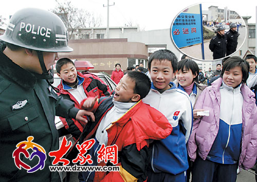 4日,济南槐荫公安分局巡警110中队民警在济南十二中门前的济南市第一个必巡岗前维持秩序。这种必巡岗,要求民警定时定点进行巡逻,并要在巡逻时到学校保卫部门签到。曲鹏张中摄