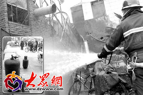 4日上午11时许,济南北园水屯路上一饭店厨房起火,室内4只煤气罐随时可能爆炸,所幸消防队员及时赶来,抢出了煤气罐,化解了险情。本报记者左庆摄