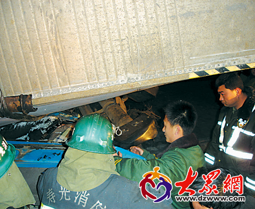 2月27日晚一场小雪使气温骤降,济青高速公路部分路段结冰。2月28日凌晨,荣成驾驶员刘某驾驶集装箱货车突遭翻车,两名驾乘人员被压在集装箱下。危急时刻,高速公路交警、路政、消防和“120”四部门展开联合救援,两小时后将两人成功救出送往医院救治。目前两人已脱离生命危险,伤情稳定。 上图为车上乘客王某(圈内)的一只胳膊和双腿被变形的驾驶室压住,根本无法脱身。