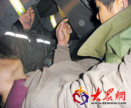 王某终于被抬出驾驶室,脱离危险。 本报记者 李冉 通讯员 张雷 摄影报道 |