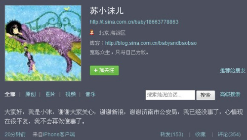 苏小沫儿:各位脖友们,小沫儿身体已经恢复,情绪也正常。谢谢大家多方努力。希望大家原谅小沫儿的一时冲动给各方带来的麻烦。我保证以后珍惜拥有的一切,做个积极乐观的人。再次致谢。