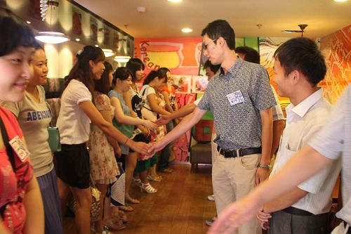 随着主持人宣布活动开始,在柔和的灯光下,伴着悠扬舒缓的音乐,大家在舒适宜人的比比客餐厅里开始了面对面进行八分钟约会。文质彬彬的男八号甚至出了一额头细密的汗水,他略带羞涩的对记者说:“第一次参加这样的约会,有点紧张。”