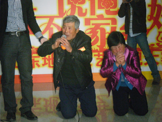 这两位老人是山东省非物质文化遗产鲁北大鼓的传承人张宝庭、杨文芝夫妇。在发布会现场,面对媒体记者,老人说:“我十六岁学习这门手艺,一辈子了。鲁北大鼓要是在我手里死了,我就是千古罪人。”说到这里,突然发生了意外的一幕,在台下早已哽咽的杨文芝冲到台上,拉住张宝庭老人,随后二人一起面向媒体的记者下跪,“我现在恳请诸位记者们,大家救救鲁北大鼓。现在,全中国就我们老两口能唱,要是我死了,鲁北大鼓就没了。拜托、拜托……我们老两口感谢你们啦……”说到这里,两位老人早已泣不成声。
