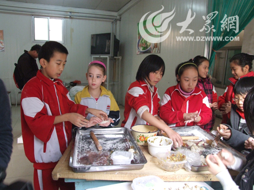 同学们挽起袖子,擀皮的擀皮,包馅的包馅,负责指导的“小老师”在一旁认真得做着示范,中国小学生教得认真,外籍小学生学得投入,不一会儿,包出了形态各异、五花八门的饺子,同学们吃着自己的“杰作”,看着浑身是面的同伴,开心地笑了。