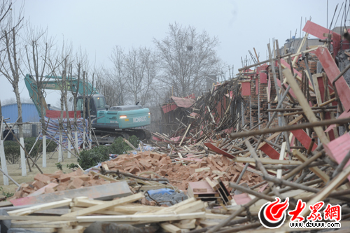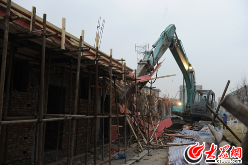 大众网济南12月23日讯(记者 王磊)今晨,在济南北园街道办事处水天福苑小区西侧,1台大型拆迁机挥舞着机械手臂,在建的5970余平方米违规建筑被拆除。