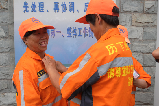换了上透气凉爽的新装,环卫大姐笑的开心(张昊宇 摄)
