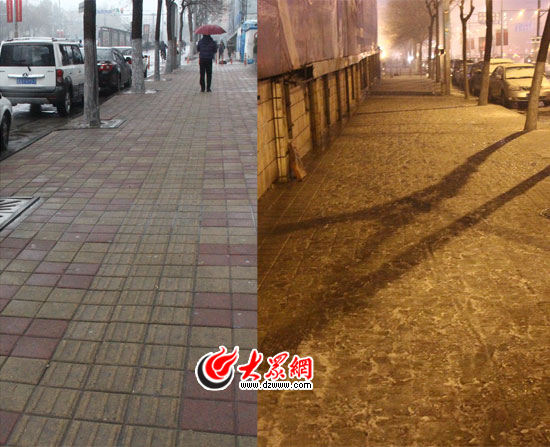 在泺源大街同一路段,右图为13日晚上的积雪情况,左图显示14日上午积雪已经全部融化。(赫洋 摄影)