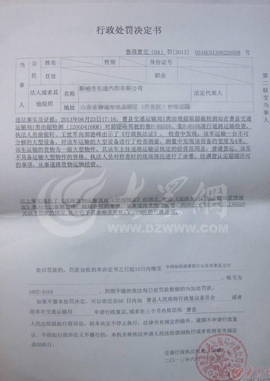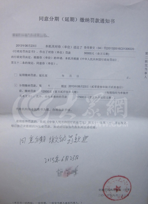 在帖子所附的《行政处罚决定书》上,大众网记者看到,关于违法事实及证据一项写着:检查中发现,该车运输一台不可分解的大型设备。对该车运输的大型设备进行了检查测量,测量中发现该设备的宽度为4米。该车运输的货物为一级大型物件。该车主《道路运输证》核定的经营范围是:普通货运。该车不具备运输大型物件的资格。以上事实违反了《道路货物运输及站场所管理规定》的规定,依据《道路货物运输及站场管理规定》第六十三条第三项:超越许可的事项,从事道路货物运输经营的应处以30000元以上99000元以下罚款的规定,决定给予处罚款叁万元整(¥30000)的行政处罚。在《同意分期(延期)缴纳罚款通知书》上则写明,罚款分两期交,第一期为12500元,第二期为17500元。
