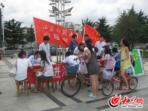 烟台海阳是山东师范大学心理学院“青春线”暑期社会实践服务队暑期社会实践活动的第一站,广场旨在本次活动以弘扬时代精神、增强新生代的心理健康意识为主旨,提高其社会意识和人本意识,促进人的科学全面发展,促进社会主义和谐社会建设。市民们纷纷表示,在生活和工作压力越来越大的今天,心理学的确是帮助大家获得健康心理的好的工具,充分体现科学发展观以人为本的理念。(刘璐)